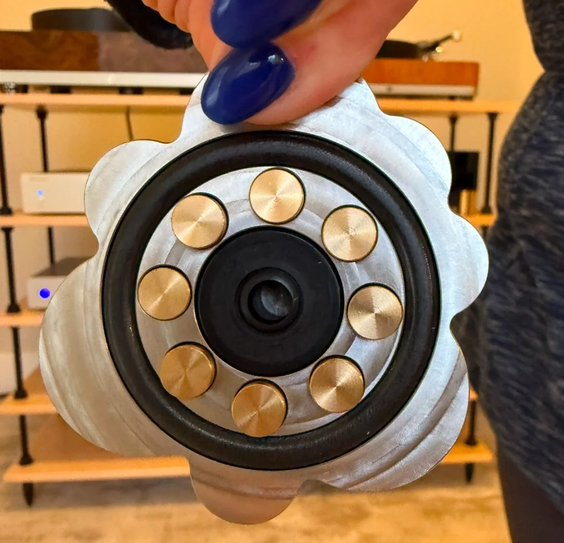 Second, eight brass rods are underslung and function independently. The rods are milled as beautifully as the rest of the unit. Ramar continues: “As soon as JEWEL is placed on the record, the rods plunge down and gently touch the surface. These transmit some of the resonances inside JEWEL, where they are eliminated. The suspension allows the individual rods to adapt perfectly to any differences in the height of the record surface caused by different label structures. This ensures that the contact surface of the brass rods remains constant for all records”.